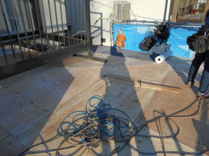 構造用合板(コンパネ)下地の上にゴムアスの防水紙(ルーフィング)を貼ります。