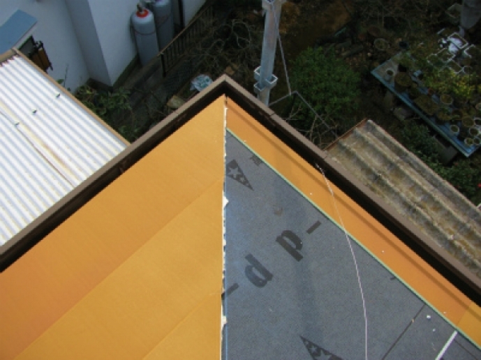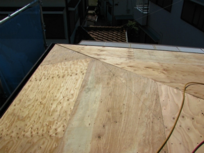 かわらUの縦の桟木を撤去して構造用合板にて下地を作っています。